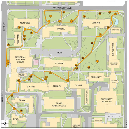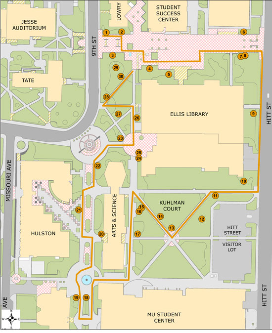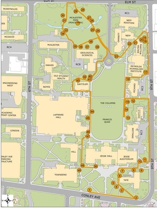The trails consist of three loops — the Jesse Hall Loop, through the Francis Quadrangle; the Lowry Mall Loop,