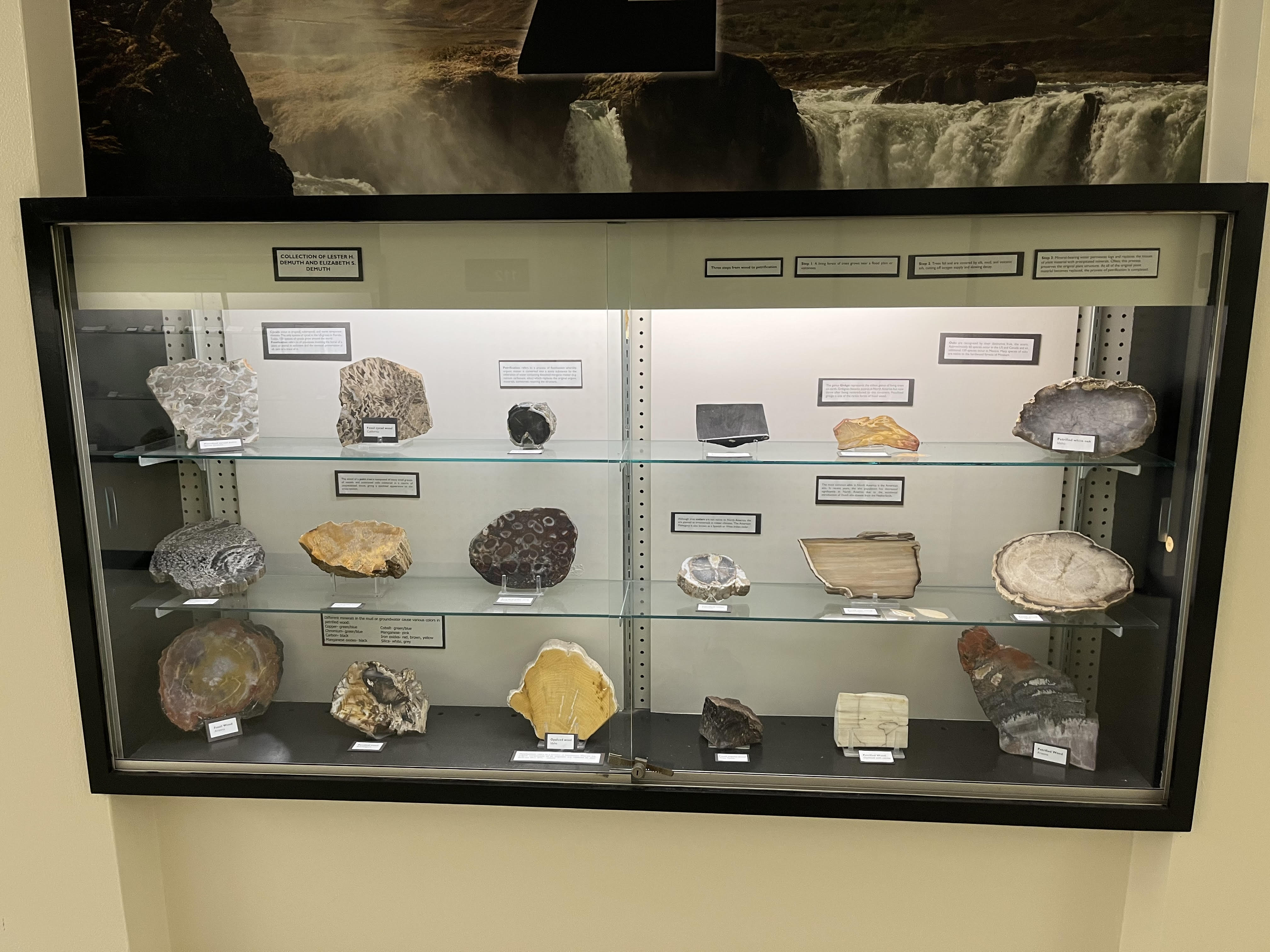 Dozens of geologic specimens on display in the hallway on the first floor and basement.
