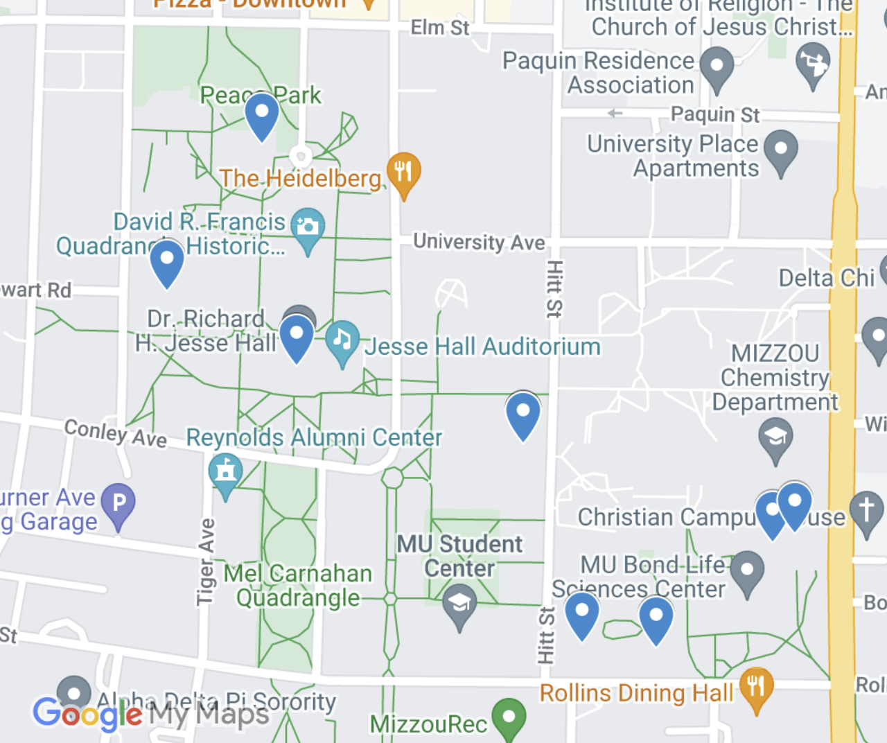 centered on Ellis Library; and the Memorial Union Loop, which meanders among early 20th century limestone buildings. Trees on each